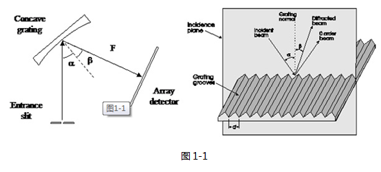 其中Βeta是衍射角,d是槽周期(這是等于槽密度的倒數(shù)),m為衍射級,λ是光的波長,如圖1-1。