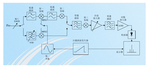 大家使用的頻譜分析儀基本都是超外差式的頻譜分析儀,今天我們來簡(jiǎn)單介紹一下它的工作原理。超外差式頻譜分析儀的簡(jiǎn)化原理框圖如下: