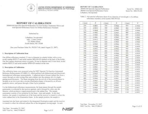 圖1、NIST出具的Labsphere積分球涂層反射率校準(zhǔn)報(bào)告