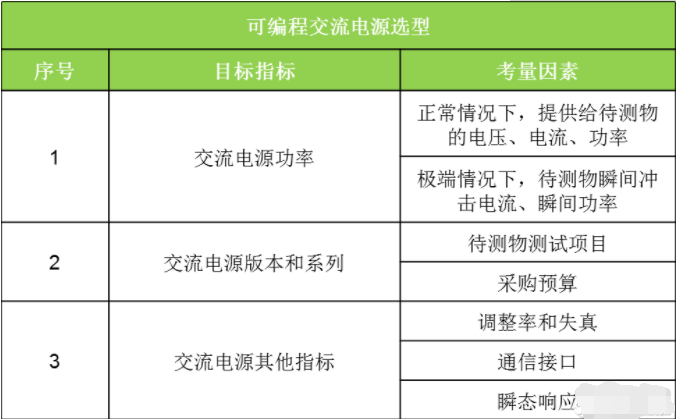 因此電子產(chǎn)品研發(fā)、認證測試、品質(zhì)驗證等階段均需能夠模擬仿真多種類型正常的或異常的交流電波形的可編程交流電源,即可編程交流電源具備強大的波形生成功能,輕松地產(chǎn)生復雜的瞬態(tài)波形,模擬輸出正常的交流電,也能模擬電力線路干擾或電網(wǎng)失真等異常交流電,并且支持電氣參數(shù)量測。現(xiàn)階段可編程交流電源型號較多,選擇合適可編程交流電源,通常按照以下順序考量(表1):