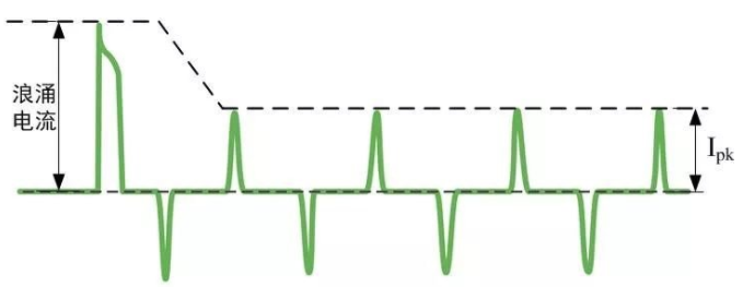 選擇合適的交流電源用于測試應用時,首先考慮待測物正常運行的電氣參數(shù),包括電壓、電流、功率等,同時須考慮到待測物在輸入電壓出現(xiàn)波動或者在不同工作模式下時可能出現(xiàn)的浪涌電流或者瞬態(tài)電流,通常這種電流的峰值會比待測物的額定工作電流大得多,尤其是不具備功率因數(shù)校正的開關方式或整流器電源、電機等非線性電子設備的啟動浪涌電流的最大峰值電流是其電流有效值的3到4倍,浪涌電流一般會出持續(xù)幾個周期到幾秒鐘,如圖所示。
