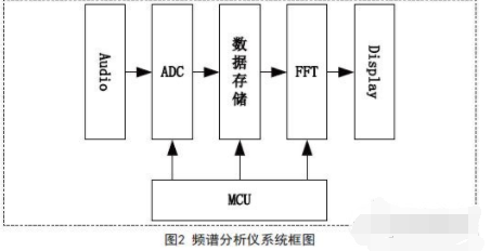 這篇文章介紹了一種基于FFT的的數(shù)字音頻頻譜分析儀的設(shè)計(jì)方案,通過ADC采樣輸入的音頻信號(hào),ADC采樣完成以后,將數(shù)據(jù)進(jìn)行倒序排列并進(jìn)行FFT運(yùn)算,最終結(jié)果通過TFT液晶顯示出來。系統(tǒng)的框圖如圖2所示。