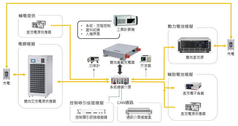 針對電動車車載充電器(OBC)測試,Chroma測試方案已廣泛應用汽車製造商、零部件廠與質(zhì)檢單位等,提供符合QCT/895測試要求與客製化服務。因應BOBC的技術發(fā)展,Chroma搶先佈局於現(xiàn)有測試基礎上加入新一代能源回收式電網(wǎng)模擬電源與雙向直流電源供應器,提供電網(wǎng)及動力電池模擬,並透過雙向I/O介面及系統(tǒng)整合,全面涵蓋待測物的應用場景。
