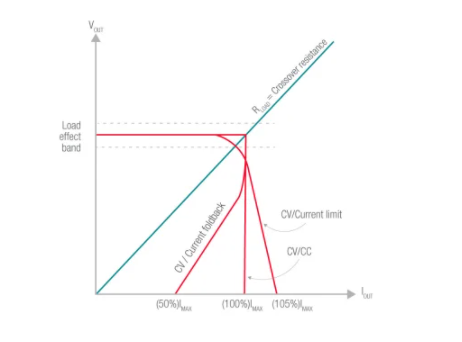 此下降稱為交叉區(qū)域。伴隨著負(fù)載電阻的進(jìn)一步降低,電源的限流電路現(xiàn)在處于活動狀態(tài)。高質(zhì)量電源將向這個恒定電流區(qū)域急劇過渡。