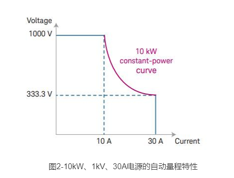 如果PMAX等于VRATED乘以IRATED,這將使其成為30kW電源,但它的額定功率為10kW。該電源能夠輸出從1000V、10A到333.3V、30A的等于10kW的任何電壓或電流組合。自動量程電源非常靈活,因為無需擔(dān)心有多個電源來覆蓋不同的電壓和相同功率水平的電流組合。