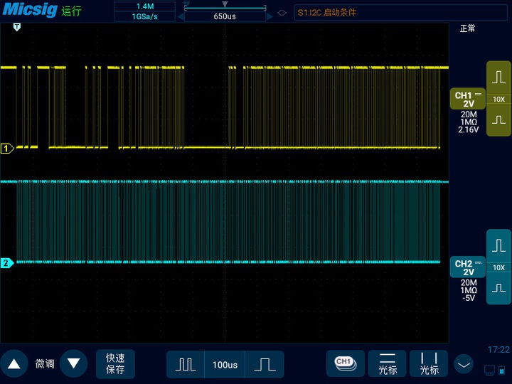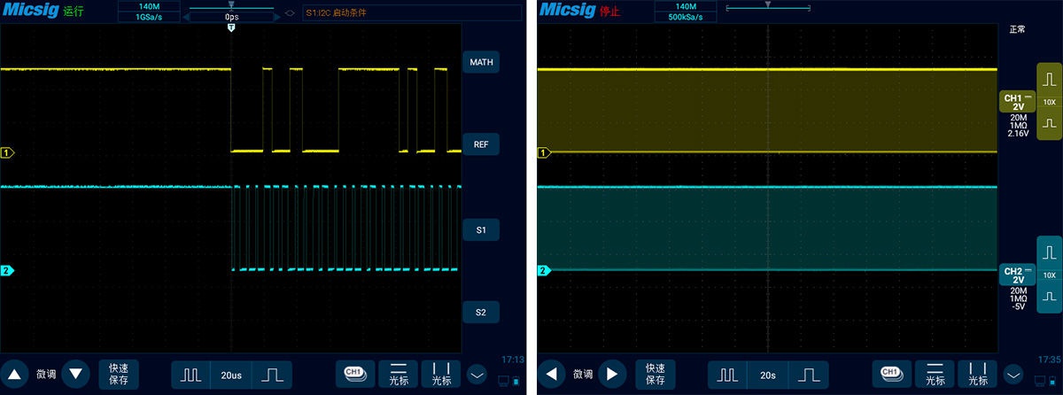 比如說下圖是一個(gè)I2C總線信號,圖左邊時(shí)基是20us,圖右邊時(shí)基是20s??梢钥吹綀D左邊是正常的脈沖信號,此時(shí)的采樣率是1GSa/s。圖右邊考慮到波形記錄時(shí)長增加,采樣率下降到了500KSa/s。