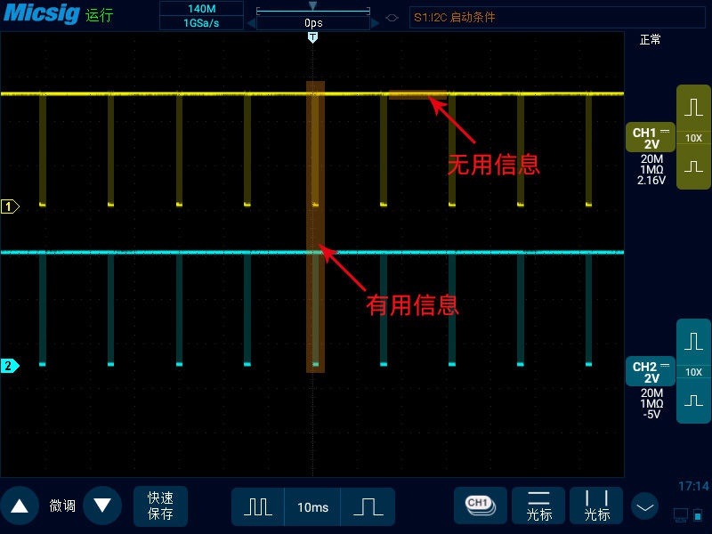 我們將數(shù)字示波器的時(shí)基打到10ms,可以看到我們采集到的I2C總線信號有很大一部分時(shí)間采集的其實(shí)都是無用信息。我們真正需要看的信號只是整個(gè)周期的一小段。并且無用信息和有用信息之間的周期都是大致一致的。