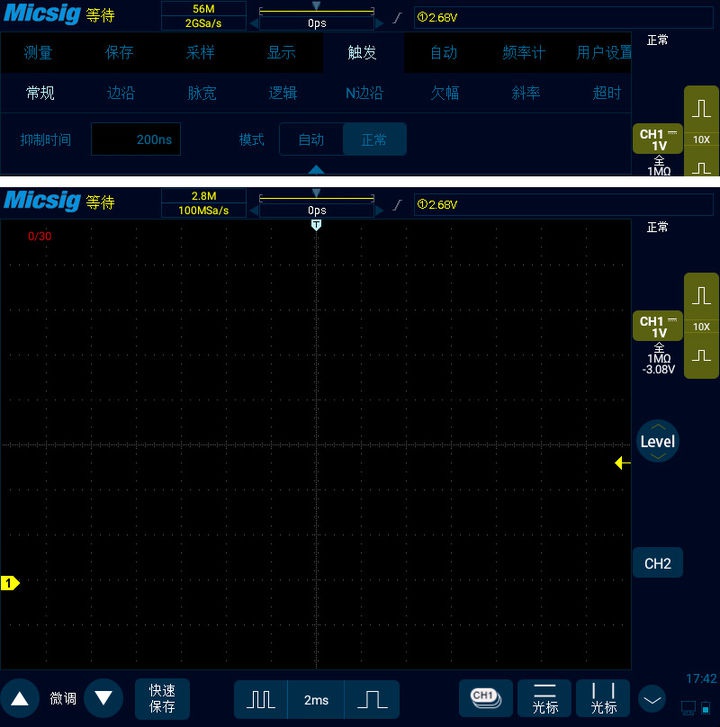 比如說我們要捕獲30個(gè)異常情況脈沖,首先我們把示波器的觸發(fā)模式改為正常,調(diào)節(jié)好觸發(fā)方式(類似單次觸發(fā)的操作),當(dāng)異常情況信號沒有到來的時(shí)候示波器處于等待狀態(tài),可以看到采集到的信號個(gè)數(shù)是0/30。