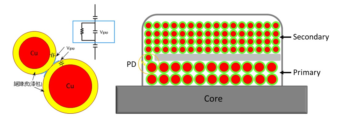 ▲圖三.變壓器??次側(cè)線圈的線材間發(fā)生局部放電