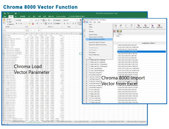 ATX3.0規(guī)范PSU各輸出信道負載測試條件設(shè)置均需參考文件編號338448 Desktop Platforms Power Supply Test Plan,超過60余項相當復(fù)雜的負載條件需要設(shè)置,故Intel另發(fā)布Test Plan Companion Calculator Excel文檔,方便PSU廠商運用計算測試負載條件。但要將如此多的負載條件一一輸入自動化測試系統(tǒng)填入對應(yīng)的測試項目進行測試,工作仍十分繁瑣費時;致茂電子8000系統(tǒng)廣泛應(yīng)用于電源產(chǎn)品的自動化測試,其具備負載向量(Vector)參數(shù)設(shè)定功能,可利用Excel編輯測試參數(shù)再匯入8000測試程序中,故致茂電子將Intel的Test Plan Companion Calculator內(nèi)容解譯并入Vector Excel格式檔,使用者只需輸入PSU功率與各輸出信道電流規(guī)格后,相關(guān)測試項目的負載條件便可自動計算帶入,再將其匯入8000系統(tǒng),如此一來測試程序(Test Program)里所有測項的負載測試條件便自動更新設(shè)定,可大幅縮短至少90%以上的測試參數(shù)修改時間,加快PSU的測試驗證。