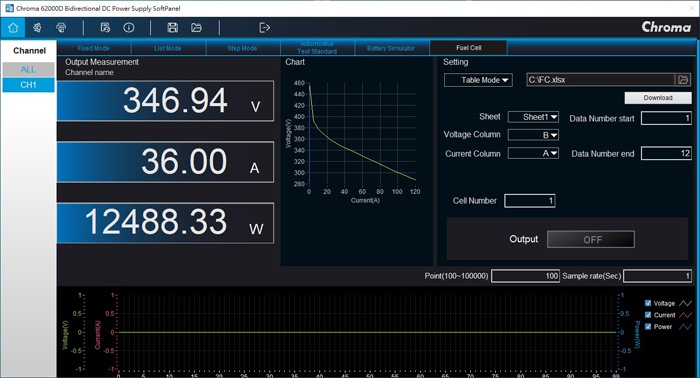 Chroma 62180D-1200直流電源作為燃料電池仿真器時可提供最多30臺并聯(lián)操作,輸出功率達(dá)540KW,輸出電流為1200A,滿足目前實(shí)際燃料電池發(fā)動機(jī)總成,并具有能源回收的功能;搭配圖形化操作軟件SoftPanel,進(jìn)行真實(shí)燃料電池特性曲線仿真功能。用戶可自行匯入完整電堆的電流對應(yīng)電壓曲線I-V curve數(shù)據(jù)數(shù)據(jù),便可進(jìn)行特性模擬的測試?;蛘咧苯舆x擇內(nèi)建Fuel Cell特性數(shù)據(jù),搭配Cell Number設(shè)定 (串聯(lián)概念,主要是提升電壓),以及Area的設(shè)定(并聯(lián)概念,主要是提升電流) ,同樣地也可以合成方式產(chǎn)出特性曲線數(shù)據(jù)。此外由于Chroma燃料電池仿真器具備毫秒級的快速響應(yīng),適合在實(shí)驗(yàn)室進(jìn)行直流電源轉(zhuǎn)換器的動態(tài)響應(yīng)及穩(wěn)定度,當(dāng)然也適用于長時間耐久性驗(yàn)證及系統(tǒng)功能性確認(rèn)。如下圖采用30臺跨柜并聯(lián)實(shí)例,實(shí)現(xiàn)大功率燃料電池仿真器對直流電源轉(zhuǎn)換器測試。