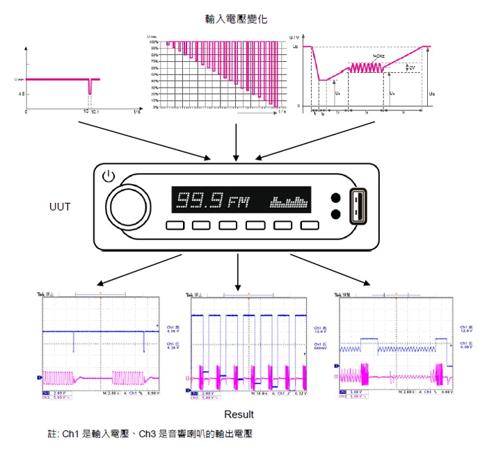 ▲Chroma 62000P進(jìn)行ISO 16750-2標(biāo)準(zhǔn)對(duì)車用音響進(jìn)行測(cè)試案例