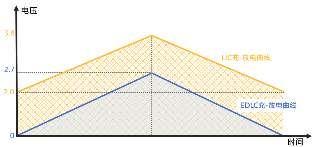 鋰離子電容器(Lithium Ion Capacitor, LIC)則結(jié)合了鋰離子電池(LIB)負(fù)極與電雙層電容器(EDLC)正極的混合架構(gòu)【圖二】,提供2.0V-3.8V的工作電壓使其能量密度較EDLC高【圖三】,同時(shí)保持高輸出功率、優(yōu)異安全性能和長(zhǎng)使用壽命,更能彌補(bǔ)LIB在功率密度不足、安全性及使用壽命上的問(wèn)題,成為目前AI運(yùn)算中心主要的電力備援選擇。