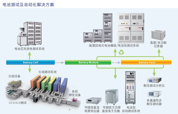 電池測(cè)試是一個(gè)十分復(fù)雜而且關(guān)鍵的過程,需要準(zhǔn)確、精細(xì)、快速、可靠的測(cè)試設(shè)備和系統(tǒng)。而Chroma電子所提供的電池測(cè)試方案,則具備全面性、多樣性和先進(jìn)性,能夠幫助客戶進(jìn)行充電、放電、容量、效率、循環(huán)壽命、溫度及安全性等方面的綜合測(cè)試,并實(shí)現(xiàn)精確、實(shí)時(shí)、遠(yuǎn)程和批量的數(shù)據(jù)采集和分析。在這個(gè)復(fù)雜的測(cè)試過程中,使用了不同種類的儀器,包括電子負(fù)載、電壓電流源、直流電源、電池測(cè)試儀及自動(dòng)化測(cè)試系統(tǒng)等。