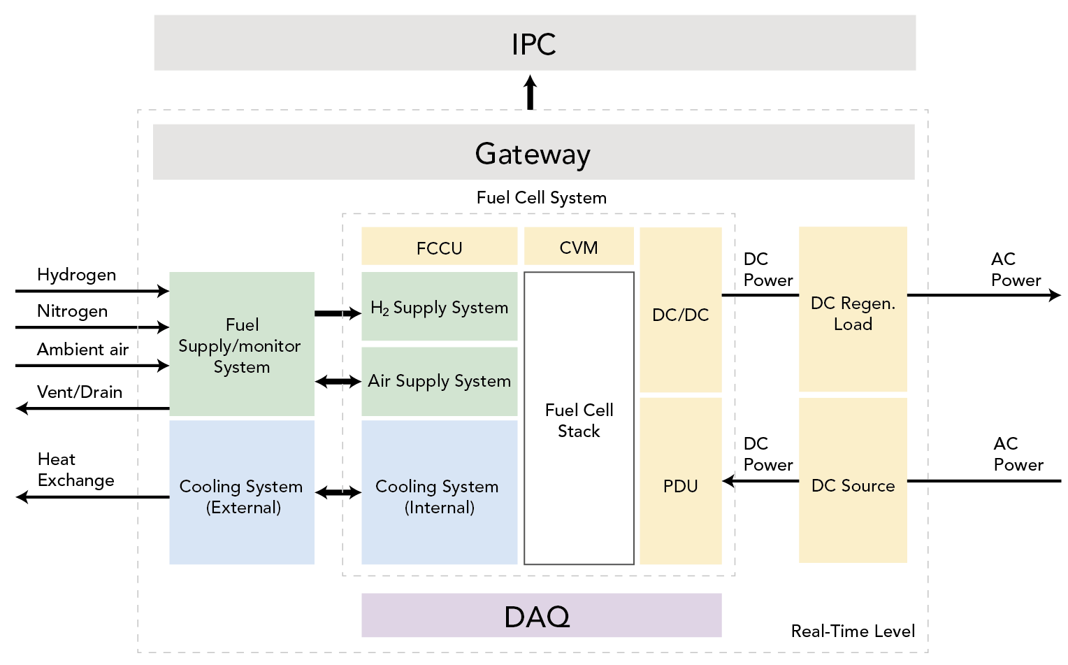 質(zhì)子交換膜燃料電池發(fā)動(dòng)機(jī)(PEM Fuel Cell System, PEMFCsys)是將燃料電池堆(Fuel Cell Stack, FC Stack)為主要以電化學(xué)反應(yīng)進(jìn)行發(fā)電,結(jié)合系統(tǒng)周邊元件(Balance of Plant, BOP)提供給燃料電池堆的外部氫氣壓力調(diào)節(jié)、空氣輸送供給、燃料電池堆散熱、輸出與供給電力控制…等模塊化整合,并組裝成為一套氣轉(zhuǎn)電(Gas to Power)的獨(dú)立發(fā)電單元。然而,燃料電池堆的輸出功率能決定燃料電池發(fā)動(dòng)機(jī)的總輸出功率,間接影響系統(tǒng)周邊元件硬體規(guī)格范疇與元件成本,整體系統(tǒng)從開(kāi)發(fā)到生產(chǎn)的階段,系統(tǒng)測(cè)試范疇會(huì)依照各周邊元件的開(kāi)發(fā)進(jìn)度下有所不同,因此系統(tǒng)測(cè)臺(tái)配置彈性的需求設(shè)計(jì)亦為重要的考量因素。