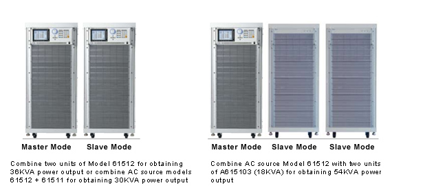 61511/61512/61611/61612交流供應器可經由(Master-Slave)并聯輸出模式以達成使用者對于高功率的需求。例如:連接5臺18KVA交流供應器在并聯模式下可實現90KVA的輸出功率。使用者還可利用專為并聯模式所開發(fā)的18KVA并聯專用機為有效替代slave單機的解決方案。請參考以下為61511/61512/61611/61612及A615103在并聯模式下的配置圖。