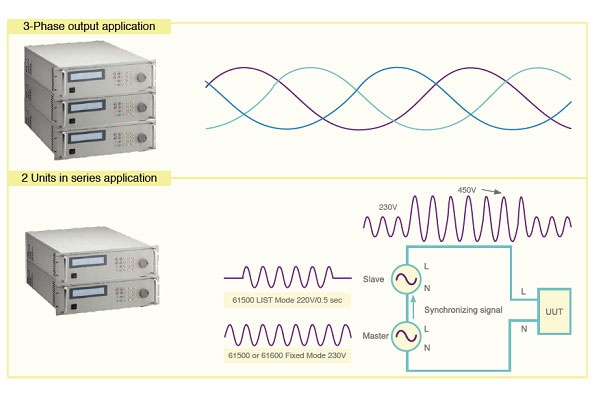 Chroma 61502可編程交流電源可以使用三臺(tái), 在三相模式的同步機(jī)制下, 串聯(lián)成三相電輸出使用. 或使用兩臺(tái)做高壓(300V-600V)輸出應(yīng)用, 搭配LIST模式可進(jìn)行瞬間高壓450V/0.5秒的測(cè)試, 如圖.