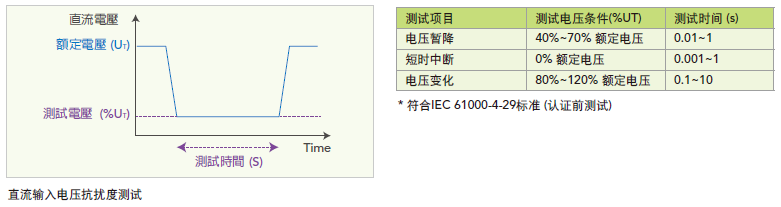 此外Chroma 61500系列產(chǎn)品能夠模擬IEC 61000-4-29* Electromagnetic compatibility (EMC)-Part 4-29: Testing and measurement techniques- Voltage dips, short interruptions and voltage variations on dc input power port immunity tests法規(guī)對于直流電壓暫降、短暫中斷和電壓變化測試條件(%UT) 如下表。