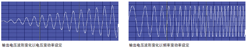 Chroma 61500系列可編程交流電源供應器可以讓使用者設(shè)定電壓或頻率的輸出變動率,當輸出的電壓或頻率改變時,就會依照設(shè)定的變動率逐漸達到最終值。這可以幫助使用者驗證產(chǎn)品的操作范圍,例如可設(shè)定頻率由47Hz逐漸增加到63Hz,或電壓由90V逐漸增加到264V,取代只驗證輸入90V、115V、230V及264V幾個電壓點的方式。另外對待測物開機時,用電壓由0V逐漸上升的方式來減少輸入的浪涌電流,可應用在馬達的啟動,或多個產(chǎn)品同時開機測試。