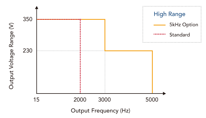 Chroma 61509/61508/61507機種可藉由選購配件提供5kHz高頻率輸出功能。而搭載此選購配件后,交流源機臺會有不同的High / Low檔位輸出電壓范圍,其細節(jié)如下圖所示。
