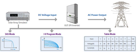 Chroma62150H-1000S具有響應(yīng)快、可控制、重復(fù)性、高穩(wěn)定性及模擬I-V曲線直流電源,于單機(jī)內(nèi)建EN50530 & Sandia的SAS模型可簡單且方 便設(shè)定Voc、Isc、Vmp及Imp等參數(shù)后產(chǎn)生一I-V曲線輸出,另外具有I-V Program功能可儲存100條不同照度及溫度下的I-V曲線于記憶體內(nèi),并且可 以設(shè)定每一條I-V曲線執(zhí)行時間(1-15,000S),此外也提供一Table模式允許使用者透過數(shù)位介面存入128~4096點(diǎn)的V&I 陣列功能,可讓使用者編輯任 何遮罩的I-V曲線,以上非常適合驗(yàn)證光伏逆變器(PV Inverter)如下性能: