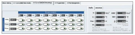 于此Softpanel內(nèi)建一Sandia及EN50530的Photovoltaic I-V Curve Model,此可方便使用者只需輸入欲測試PV Inverter的輸入功率值(Pmax)、 Fill Factor、Vmin、Vnom及Vmax值,然后使用者可直接按要測試的功率百分比值(5%、10%、20%、25%、30%、50%、75%、99.9%),此Softpanel可自動地產(chǎn)生此測試的太陽電池I-V曲線,接著直接按下載至單機(jī)后開始模擬此I-V曲線予PV Inverter測試Conversion Efficiency。