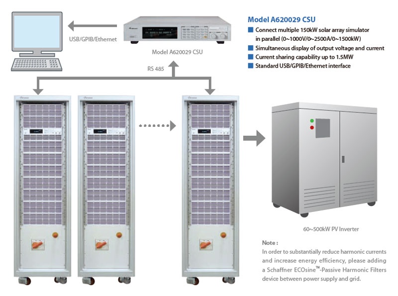 大功率太陽電池陣列模擬需求于商業(yè)用及發(fā)電站用光伏逆變器測試時,使用者可簡單地并聯(lián)方式連接二臺或多臺電源模組以達(dá)到1.5MW。 Chroma62150H-1000S電源供應(yīng)器具有主/從并聯(lián)控制模 式達(dá)10臺150kW輸出,使并聯(lián)操作模式快速又簡易,在此模式中,使用者只需透過前面板或遠(yuǎn)端數(shù)位控制主(Master unit)單機(jī),系統(tǒng)會自動將設(shè)定數(shù)值下載資料到從屬(Slave unit)單機(jī),具有高速同步訊號控制處理,且系統(tǒng)具有自動均流控制。