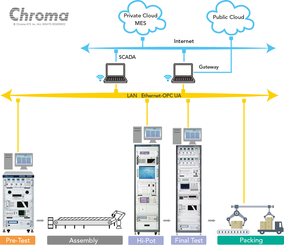 Chroma 8000自動測試系統(tǒng)適合現(xiàn)代化的大規(guī)模量產(chǎn)生產(chǎn)線,可搭配支援Chroma Sajet制造資訊系統(tǒng)(Manufacturing Execution System, MES)進(jìn)行測試站別、人員、產(chǎn)品序號及測試程式的控制與管理,以及測試數(shù)據(jù)上傳中央伺服器功能,達(dá)到測試程式集中管理與數(shù)據(jù)資料搜集/報表分析等應(yīng)用,協(xié)助客戶完成智能工廠之目標(biāo),提高產(chǎn)品品質(zhì)、效能,降低生產(chǎn)成本,創(chuàng)造企業(yè)利益最大化。另Chroma可提供客制化Shop-Floor控制系統(tǒng)服務(wù),連結(jié)客戶廠內(nèi)既有MES,到目前為止已協(xié)助眾多海內(nèi)外世界級制造大廠完成MES系統(tǒng)整合之實(shí)績案例。