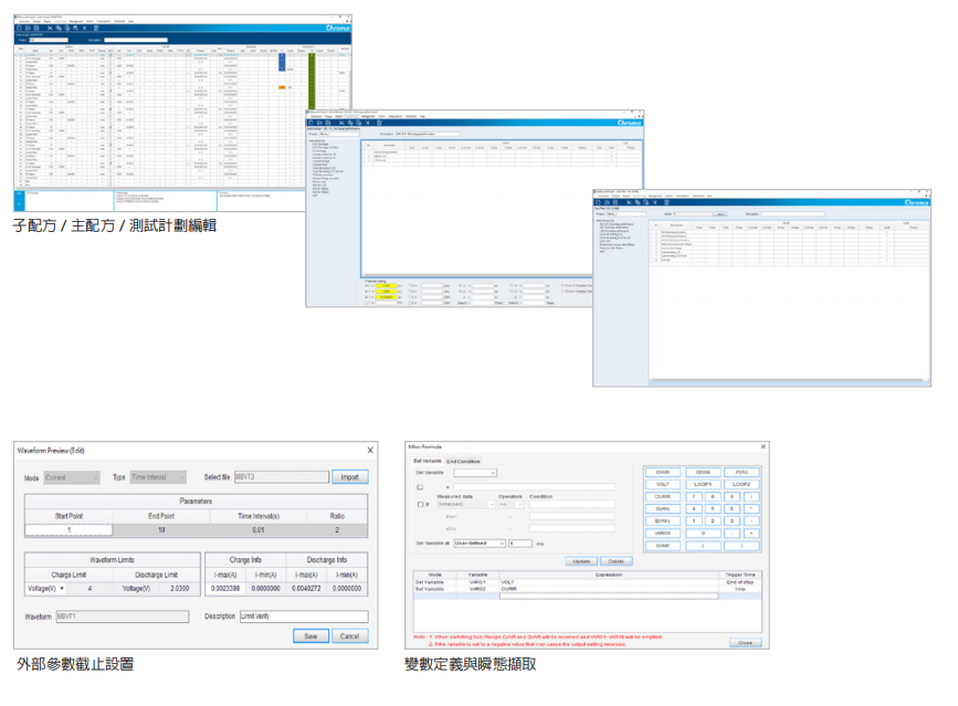 階層式編輯構(gòu)架(測(cè)試計(jì)劃→主配→子配方),可將現(xiàn)有配方透過(guò)替換測(cè)試物規(guī)格直接共享測(cè)試、或是透過(guò)彈性組合既有子配方來(lái)快速建立完整計(jì)劃,以及創(chuàng)建新配方來(lái)滿足各類型充放電測(cè)試應(yīng)用。