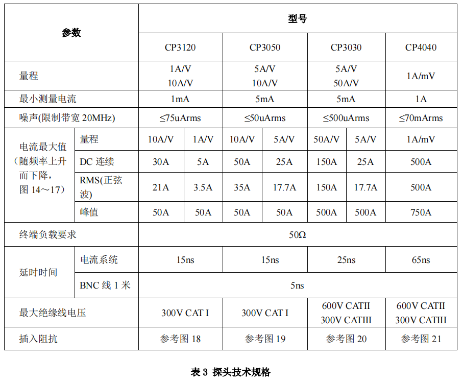 電流探頭技術(shù)規(guī)格(典型)