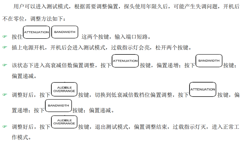 出廠設(shè)置:出廠設(shè)置默認(rèn)為高衰減倍數(shù)檔位、選擇 FULL 帶寬、打開聲音報警功能。產(chǎn)品具有自動記憶功能,自動保存關(guān)機前狀態(tài)。