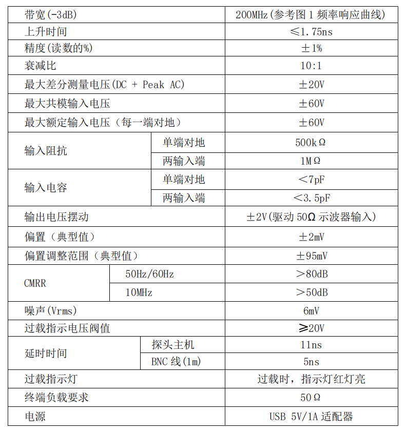 DP6020 探頭是具有浮地測量功能的低壓差分探頭。測量電壓±20V(DC+Pk),其帶寬最高達200MHz,提供 10:1 的衰減設置,具有 1 MΩ 的輸入阻抗,以及 3.5 pF 的低輸入電容,可以最大程度地降低電路負載,具有過壓報警功能,可以兼容任何具有 50 Ω BNC 輸入的示波器,并可以通過示波器或計算機上的 USB 端口供電。在各種應用中得到廣泛使用,可以為當今的高速功率測量、車載總線測量和數字系統(tǒng)設計提供出色的通用差分信號測量。