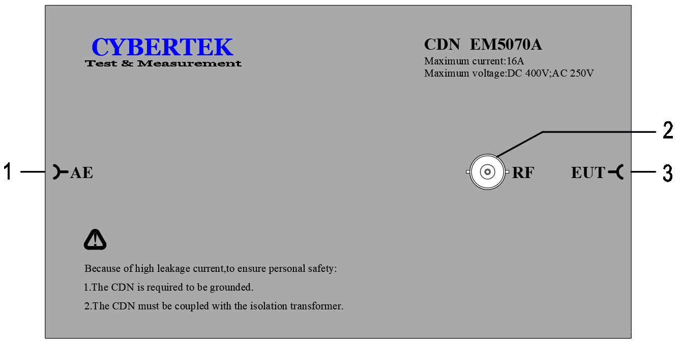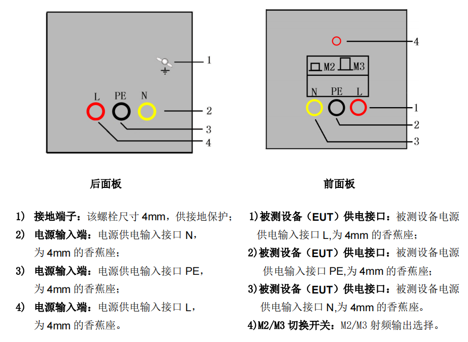 被測設備(EUT)供電接口:被測設備電源供電輸入接口,為 4mm 的香蕉座。