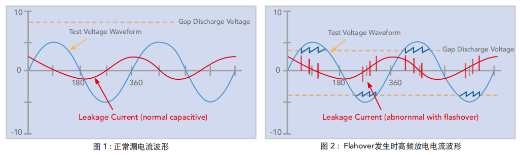 19070及19050系列與Chroma其它安規(guī)測試系列儀器同樣具有電氣閃絡(luò)偵測功能。電氣閃絡(luò)是絕緣材料內(nèi)部或表面因高電界產(chǎn)生電氣放電,待測物失去原有之絕緣特性,形成瞬時或非連續(xù)性放電,導(dǎo)致碳化導(dǎo)電渠道產(chǎn)生或產(chǎn)品傷害。若只以漏電流判定則無法檢出不良,因此Flashover偵測為高壓測試不可或缺的檢視項目之一。