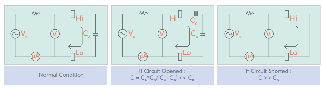 OSC功能為偵測測試過程中是否有開路(接觸不良)或短路(待測物短路)的情形發(fā)生,測試過程中若發(fā)生開路現(xiàn)象,會導(dǎo)致不良品誤判為良品;若發(fā)生短路現(xiàn)象,可提早得知并篩選,減少對治具設(shè)備的傷害,節(jié)省測試成本。一般耐壓測試產(chǎn)品皆呈電容性(Cx),在正常狀態(tài)下可能在數(shù)十pF至數(shù)μF之間。一旦發(fā)生連接斷路則會在斷路界面形成微小電容量(圖2之Cc),一般低于10pF,而呈現(xiàn)整體電容量遠低于正常產(chǎn)品現(xiàn)象。而當(dāng)待測物短路或接近短路時時則會呈現(xiàn)電容量遠高于正?,F(xiàn)象。因此可利用電容量變化之上下限值判定出短路問題。