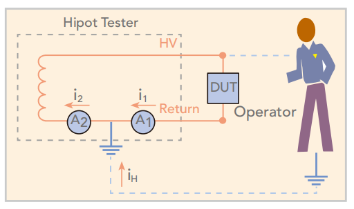 安規(guī)測試的目的是為了保護產(chǎn)品使用者的安全。Chroma 19070及19050系列擁有GFI人體保護功能來保護測試人員。在突發(fā)人體感電的情形下,GFI能夠立即切斷儀器之電壓輸出,保護操作員不受電氣傷害。GFI功能以偵測從地端(Earth GND)流回之電流(iH)與RETURN端電流(i1),比較后若大于0.5mA,則會在立即切斷電壓輸出。