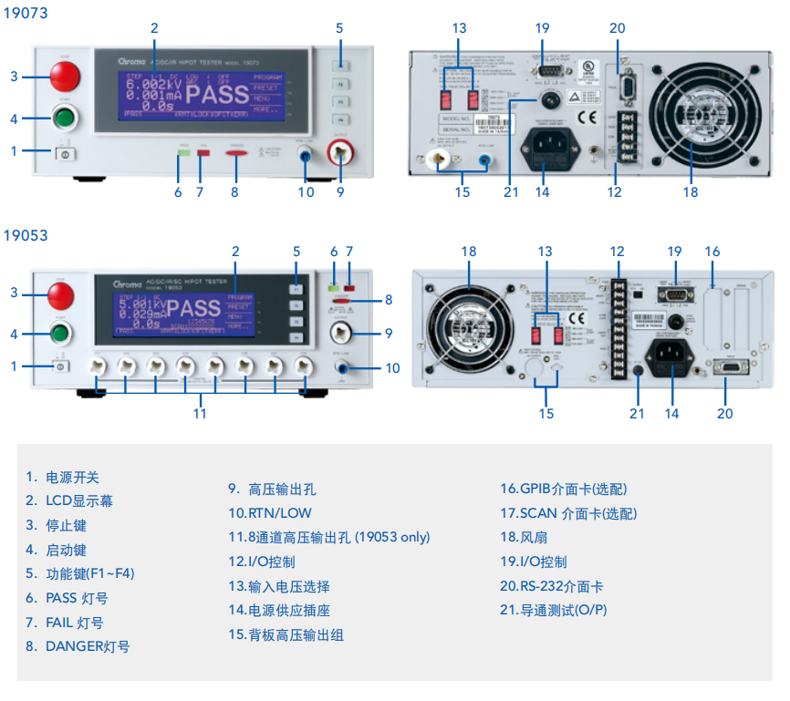 19050系列耐壓測試器有3個機種供選擇,19052ACV/DCV/IR耐壓測試器為單通道;19053ACV/DCV/IR耐壓測試器內(nèi)置8信道高壓掃描功能;19054 ACV/DCV/IR耐壓測試則內(nèi)置4信道高壓掃描功能。配有數(shù)位顯示面板與易于操作的界面,簡單執(zhí)行耐壓與絕緣測試,為新型耐壓測試器。