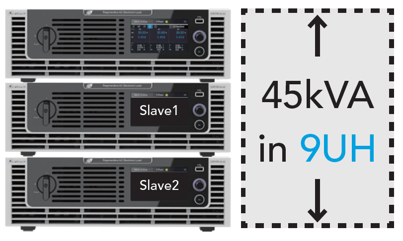 Chroma 63800R系列能源回收式交流電子負(fù)載具備主從機(jī)(Master-Slave)并聯(lián)功能,能以總并聯(lián)臺數(shù)最多三臺來滿足更高的拉載功率需求。用戶可藉由連接三臺同功率63800R系列產(chǎn)品,以一臺主機(jī)加二臺從機(jī)的并聯(lián)架構(gòu),實(shí)現(xiàn)9U硬體高度內(nèi)含總拉載功率45kVA的高功率密度配置。