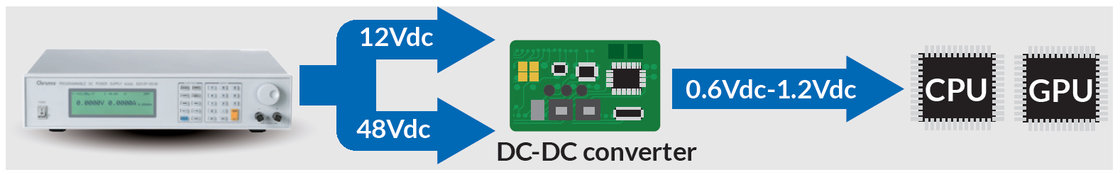 以CPU及GPU供電順序來看,多數(shù)是由12V或是48V經(jīng)過DC-DC轉換器,降為0.6V至1.2V給CPU及GPU的電源使用,在DC-DC轉換器前端可以參考Chroma 62000P系列,具有40V/120A/1,200W及80V/60A/2,400W輸出能力適合選用,其DC-DC模塊輸出電壓范圍約在0.6V至1.2V,63202 -20具有20V、1,000A或2,000A、2,000W帶載能力,特別適合低壓大電流等相關測試。