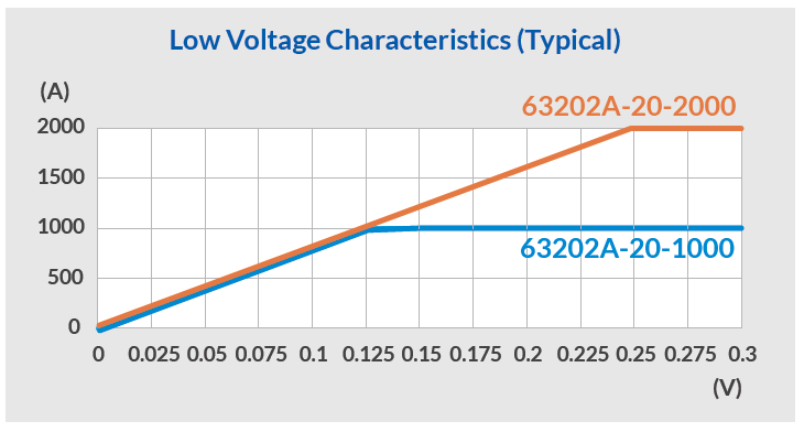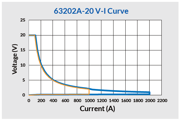 低壓大電流電子負載,具有卓越的低電壓特性,特別是63202A-20-2000型號,其負載端最小操作電壓可達0.25V,在此電壓下提供高達2,000A的最大額定電流。需特別注意若受線材壓降影響,導致負載端低于0.25V,則無法提供2,000A之電流。此外,即使在電壓低于0.25V至0V區(qū)間內,該設備仍能拉載電流,展現(xiàn)出穩(wěn)定的性能,可參考低電壓操作特性V-I曲線圖*。