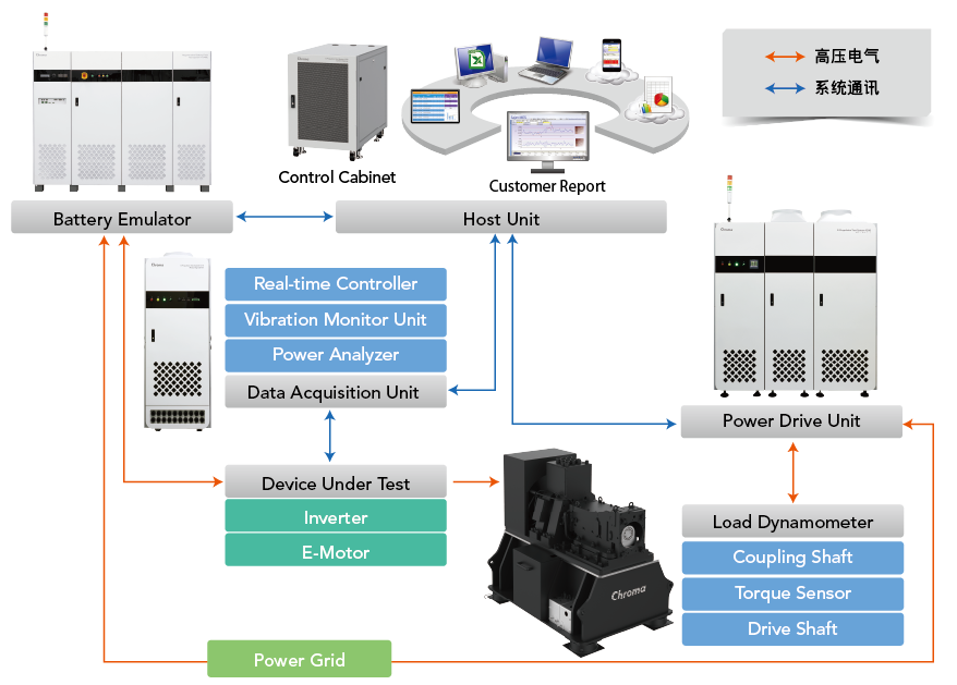 Chroma 1210電驅(qū)動總成測試系統(tǒng)主要用于車用動力系統(tǒng)的性能標定及驗證,具有載入整車動態(tài)模型用于機械部件的系統(tǒng)仿真驗證的能力,系統(tǒng)操作采手動或程序控制等方式,并可同步記錄電壓、電流、功率、轉(zhuǎn)速、扭矩、溫度等物理量參數(shù)。測試中所產(chǎn)生的電力透過Chroma 雙向直流電源17040系列及62000D系列能源回收裝置回饋到市電,并使用電池模擬之功能,即時模擬車輛運行時電池的反應特性,增加驗證的可靠度。
